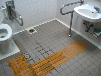 この点字ブロック、多目的トイレの中にまで続いておりまして、