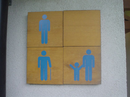男性用を示すトイレのマークには、杖を突いている人のほか、“連行されるバンザイ子供”が描いてありますね。