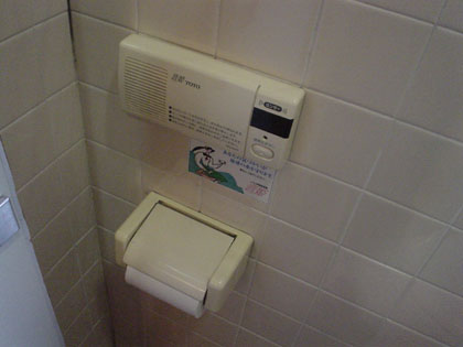 共用トイレのための配慮として音姫が個室についています。
