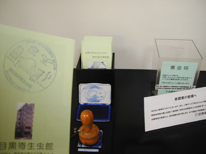 パンフレットに寄生虫館スタンプ、そして募金箱が置いてあります。
