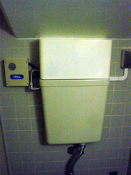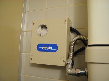 しかも女性のアナウンスが終わるとこのスピーカー、間髪いれずに鳴り始めます。トイレに響くその音は、あの音姫(TOOT)や流水音(INAXほか)でお馴染みの擬似水流音です。