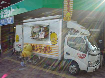 このトラックはチキンラーメン誕生50周年を記念したイベント用のキャラバン隊でして、