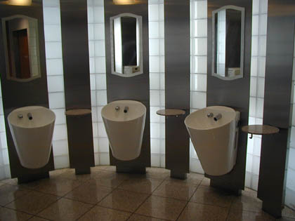 小便器や洗面台、そのそれぞれの間にはフックのついた丸い小さなテーブルが。