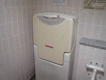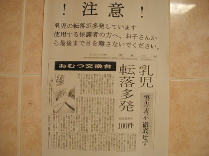 上の写真で見切れている警告表示のステッカーを貼るようにと、経済産業省からの要請を受けたオムツ台の販売メーカーのTOTOなどが、オムツ台を装備して いる各施設にステッカーを配布したうえでお願いしているらしいけど、見栄えが良くないと渋られているとの事が、この多目的トイレの壁に貼られている新聞の 切り抜きには書かれています。