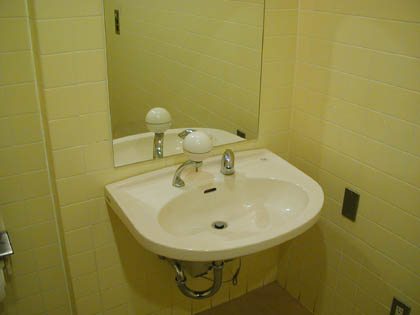 洋式便器の脇の小さな手洗いは水栓が壊れています。