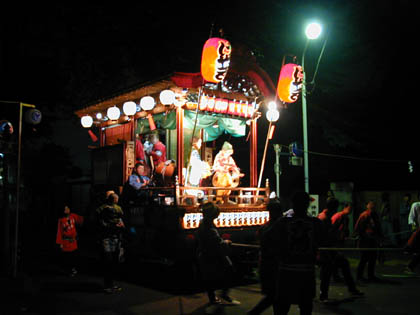 暗闇祭りに町を練り歩く山車と本殿