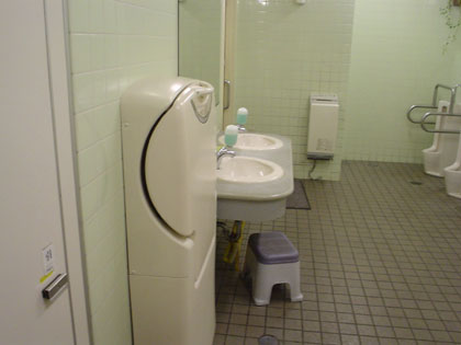 この施設の1階南側にある多目的トイレには、普通の便座が利用できないくらい小さな子供のための“子供用の便座”が置いてありますが、北側のこのトイレには、子供用の小用トイレはあったも子供用便座はありません。