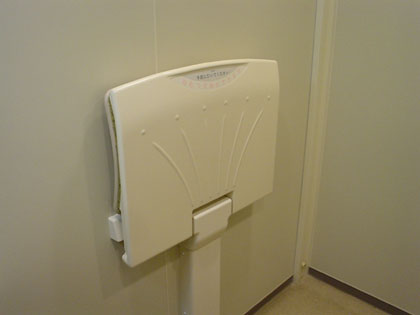 この多目的トイレにはオムツ台とベビーキープが装備されています。