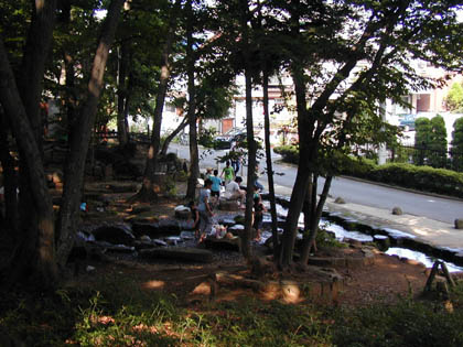 湧き出た水がせせらぎと合流する場所は水遊びができるので、この時期は大人気・活況を呈しています。