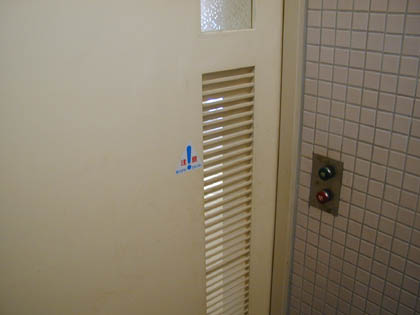 「犯罪を見逃さない」の隈取り目つきのステッカーで警戒防備された女子トイレの入り口と比べ、