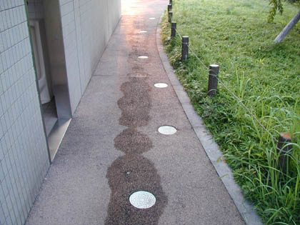 建物真ん中の多目的トイレの前には、視覚障害者用の誘導ブロックと、