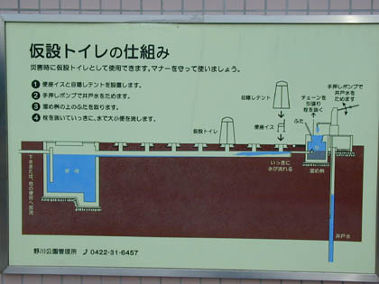 武蔵の森公園の仮設トイレと井戸水の使用例