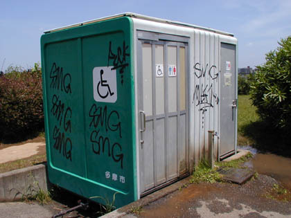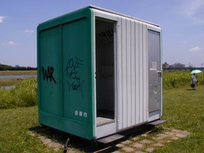 常設型のトイレだと水の流れを妨げる可能性があるので、防水の妨げにならないようにと、河川敷のトイレは移動可能な簡易型が多かったわけです。