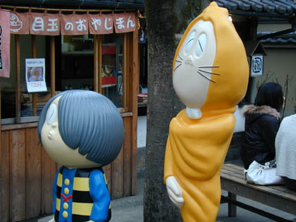 店の前には鬼太郎とねずみ男のオブジェが立ち、まるで参拝客をお出迎えしてくれるかのようです。