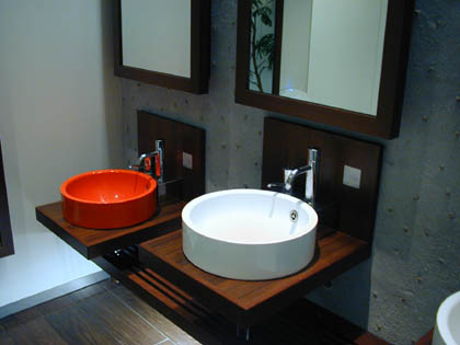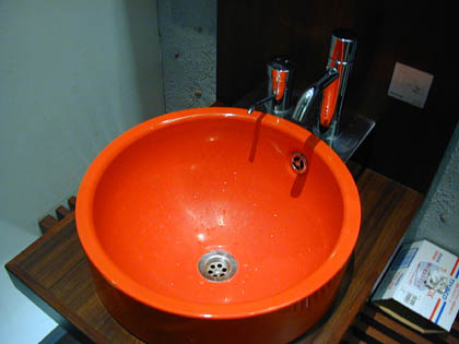 一段低くなっている真紅の洗面台。