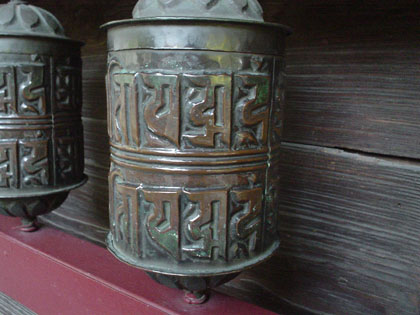 本堂の回廊には108個の、経文が描かれた「マニ車(例えるなら、トイレットペーパーより一回り大きい赤ちゃんのガラガラ)」がグルリと配置されていまして、