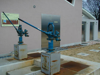 平和な今、トイレの裏は災害用の井戸および災害トイレ設置場所となっています。