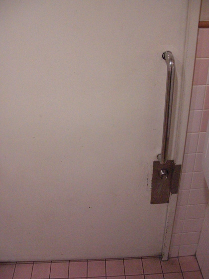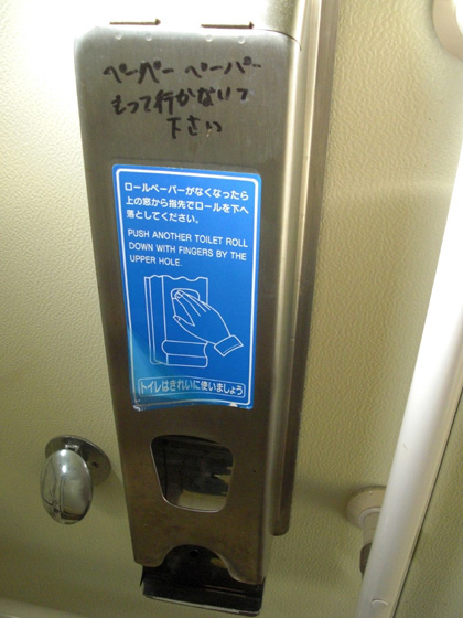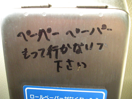 トイレットペーパーがよく盗難にあうのか、黒のマジックで「ペーパーペーパーもって行かないで下さい」と切なる注意書きが・・・・・・写真を撮る私の脳裏に、なぜか林家ペーパーの顔が浮かぶ。