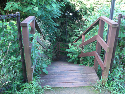 この細長い公園の南側に、このような木の階段が2つありまして、