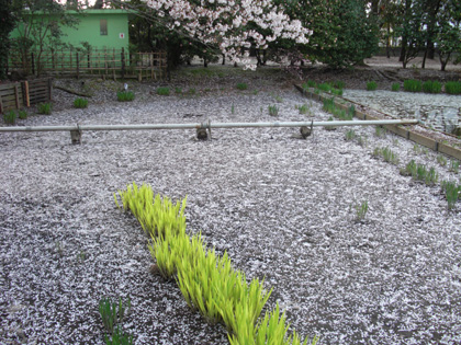 茶色い土の色に、たくさんの桜の花びらが散らされている様は、