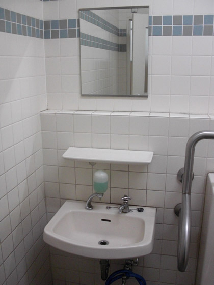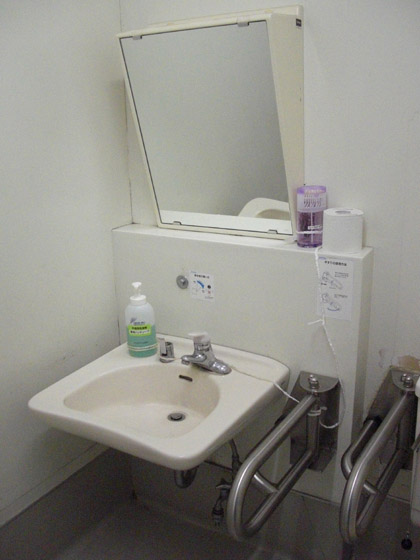 手すりは充実しているとはいえ、車椅子での運用ができない南側のトイレと違い、北側の1階と3階には多目的トイレが設置されています。