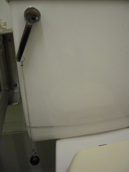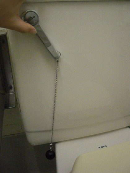 レバーの先に重りのついたチェーンがぶら下がっており、この鎖を下に引くだけで簡単に洗浄レバーを回すことが可能になるという――人類最大の英知がココに顕現しているわけなのですが・・・・・・このトイレ