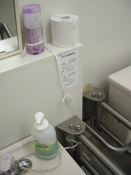 石鹸のボトルと芳香剤は、ビニール紐で手すりに括られておりました。