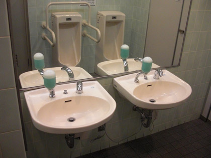 一枚鏡を前に並ぶ2つの洗面台には液体石鹸。