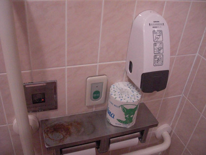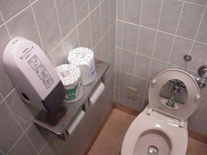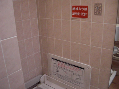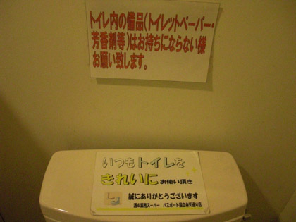 その向こうの壁には、トイレットペーパーや芳香剤をお持ち帰りしないようにとの張り紙。