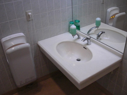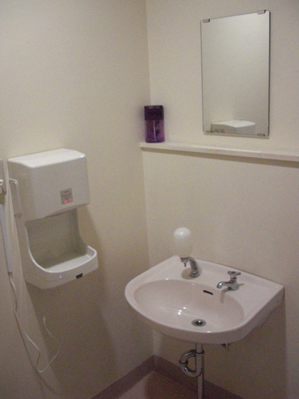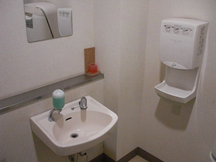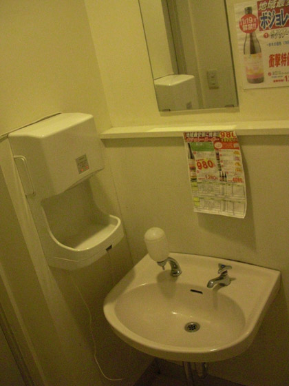 ドアを入ってすぐの左には、捻り水栓の洗面台と液体石鹸、エアータオルが置いてあります。