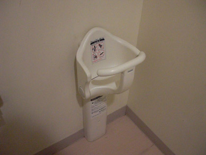 トイレ内の広さを思えば多目的トイレですが、あるべき手すりが壁の“L字”のモノだけで、右にあるべき手すりがありません。