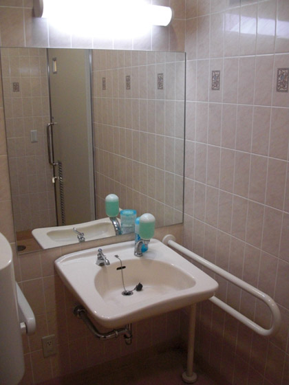 多目的トイレの洗面台も液体石鹸にエアータオル、