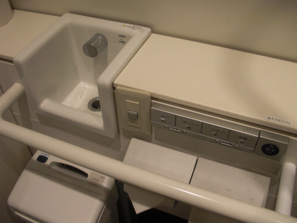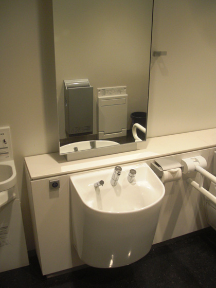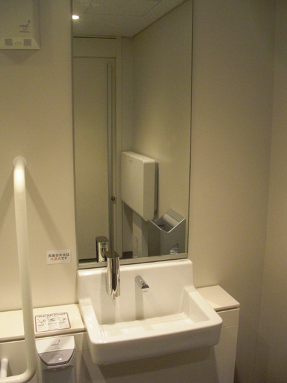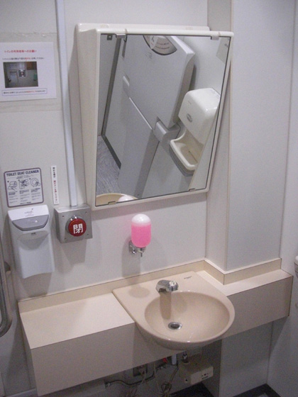 入口のドアを閉めるための赤い「閉」ボタンが洗面台のところにある、これがこの多目的トイレの特徴でしょうか。