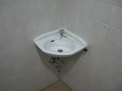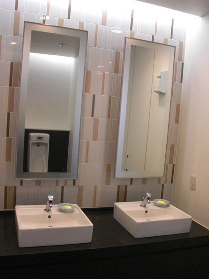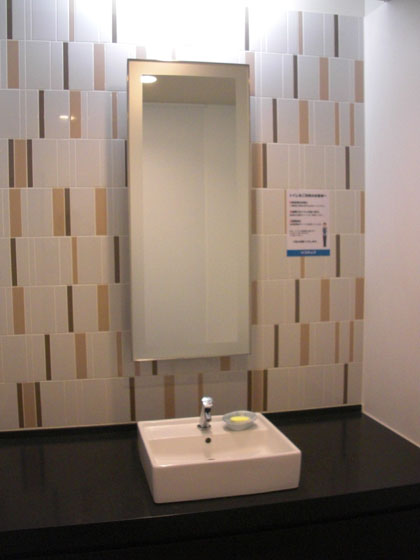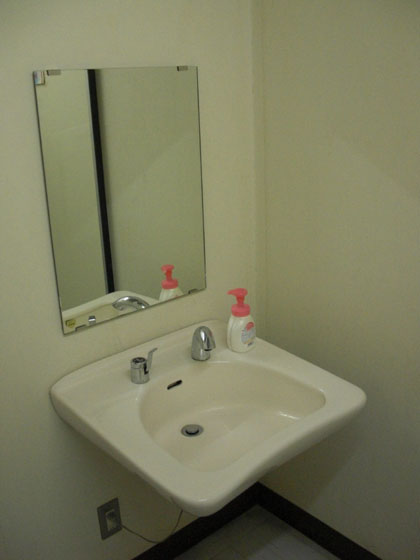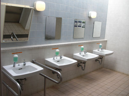 多目的トイレの外――男性用トイレ内の洗面台には手すり付き、傾斜鏡付きの洗面台も用意されています。