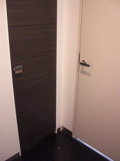 入り口の扉を入ってすぐ右手に、個室トイレの黒系のドア。