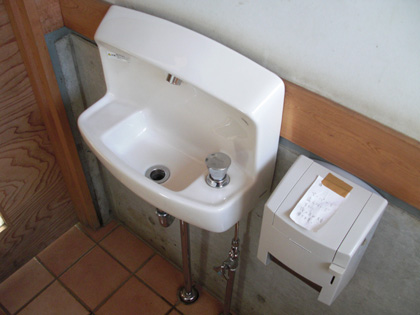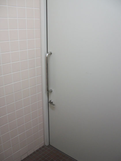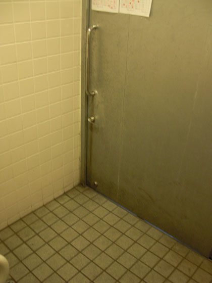ちなみにトイレットペーパーフォルダの上に見える張り紙には、「ペーパーを盗らないで下さい。後の方が大変困ります」と書いてあります。