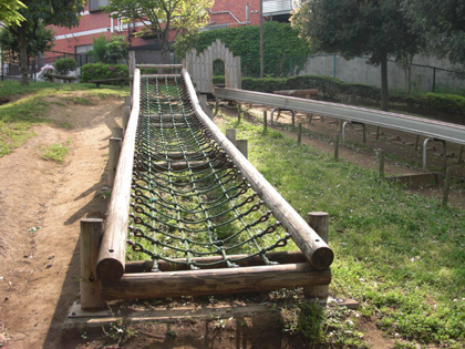 長い滑り台のほか、アスレチック的な遊具もある公園。緩やかな斜面を上り下りしてれば自然と体力もつきそうな気がします。