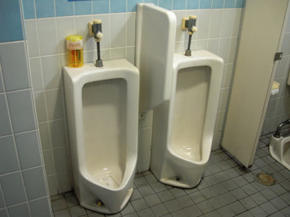ここの小用トイレは押しボタン式洗浄のが2つ。