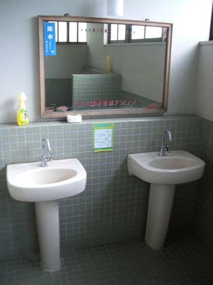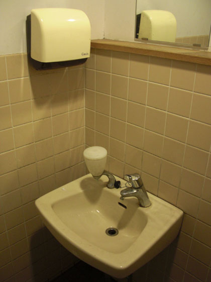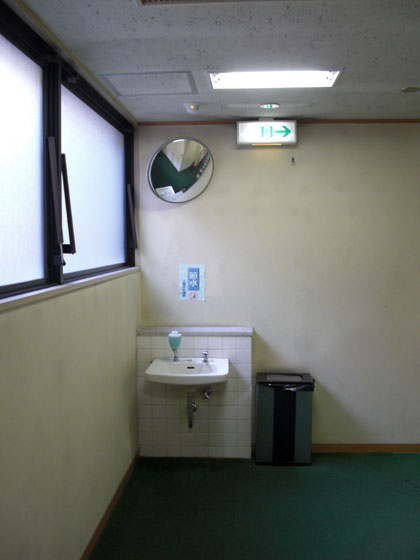 トイレ前の廊下にも液体石鹸付きの洗面台が用意されているので、手を洗いたいだけの人にも便利な感じです。