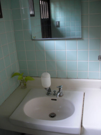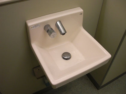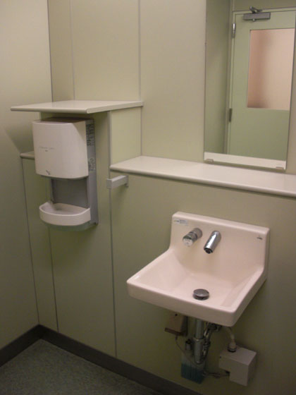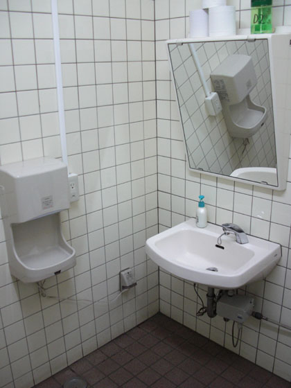 トイレ入り口脇にある洗面スペースは狭く、人の流れを考えると渋滞や出会い頭の衝突未遂が頻繁しそうなレイアウトですね。