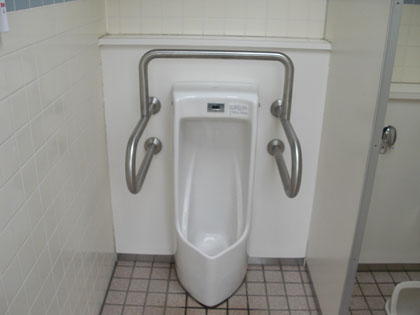 男性用トイレのスペース、約4分の1を占めるちょっと大きめの手すり付き洋式個室の2つです。