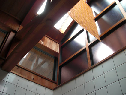 多目的トイレの天井には、夏の陽射しを避けるためか簾がかけてありました。