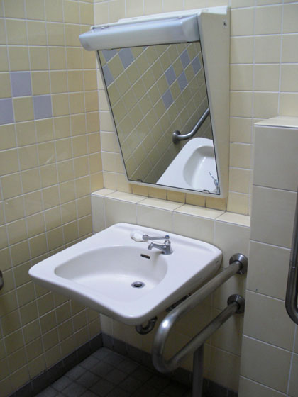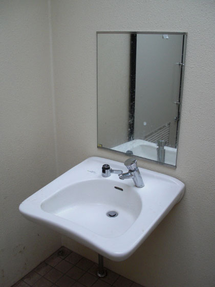 一般男性用トイレともども多目的トイレの洗面台にも鏡はありません。