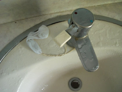 公衆トイレなのに、各洗面台には固形石鹸(袋入り)がついています。