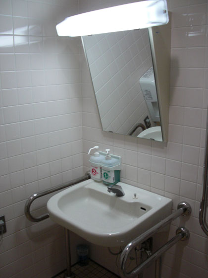 多目的トイレの洗面台にも液体石鹸と消毒液、