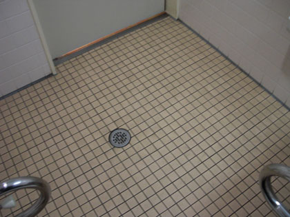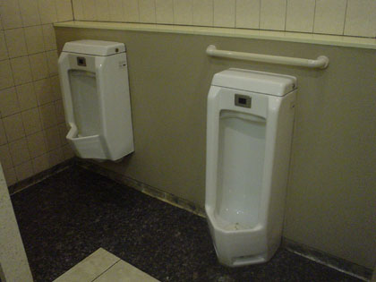 どの階の男性用トイレでも、小用トイレについている手すりは頼りがいの無い“一”の字となっています。