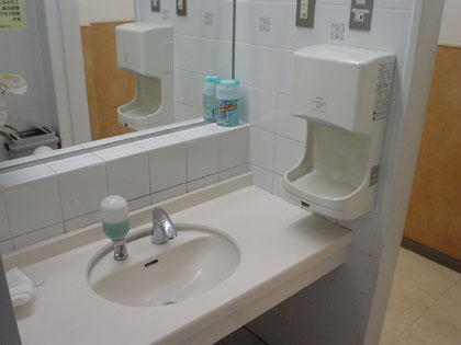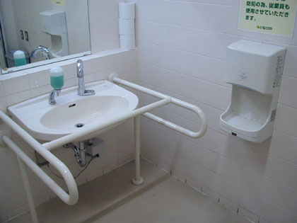多目的トイレの洗面台にも液体石鹸とエアータオルが設置されているのはグッドでしょう。