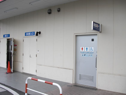 正面に共用トイレ(男女および多目的)の入り口があり、