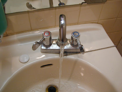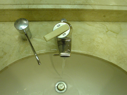 手洗いの水栓は右へ捻れば水。左へ捻ればお湯がでます。