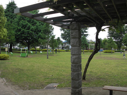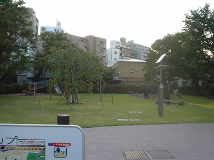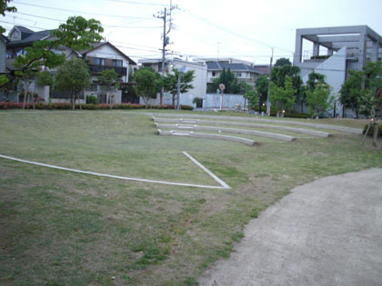 芝生の公園というよりも憩いの広場といった感じで、遊具は健康器具が幾つか置いてあるだけです。